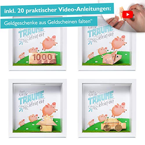 Origineel geldcadeau: deze spaarpot is ook uitstekend geschikt als verpakking en presentatie voor geldgeschenken. Naast de coole spaarpot krijg je van ons meer dan 20 video-instructies zoals je van bankbiljetten leuke figuren vouwt. Geen saaie geldschokken, wees creatief en gebruik onze praktische video-instructies voor je geld cadeau.