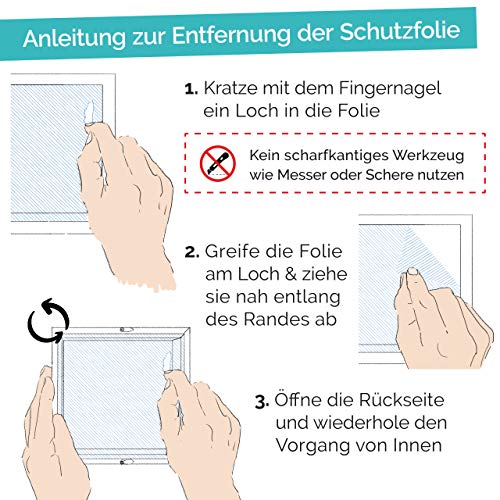 Instructies voor het verwijderen van de beschermfolie – in plaats van glas gebruiken we voor onze Money Box een plexiglasschijf aan de voorkant, omdat deze minder breekbaar en gevaarlijk is. Op de ruit bevindt zich van binnen en buiten elk een beschermfolie. Deze folie beschermt het product tijdens de productie en het transport tegen ongewenste krassen. Om de folie probleemloos te verwijderen, moet je de handleiding in afbeelding 5 volgen.