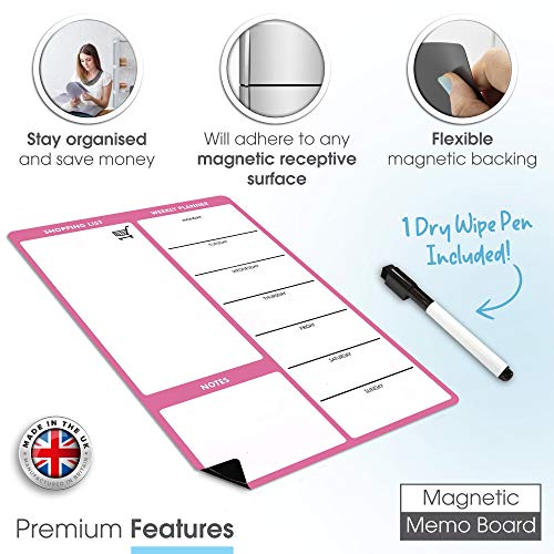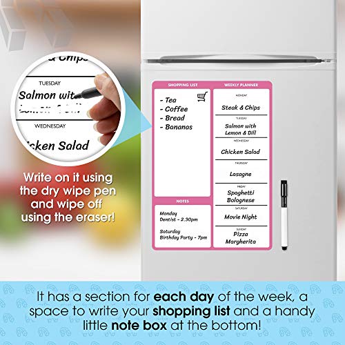 Veelkleurige, magnetische, droge wisbare maaltijdenweekplanner en notitiebord (roze), inclusief pen.